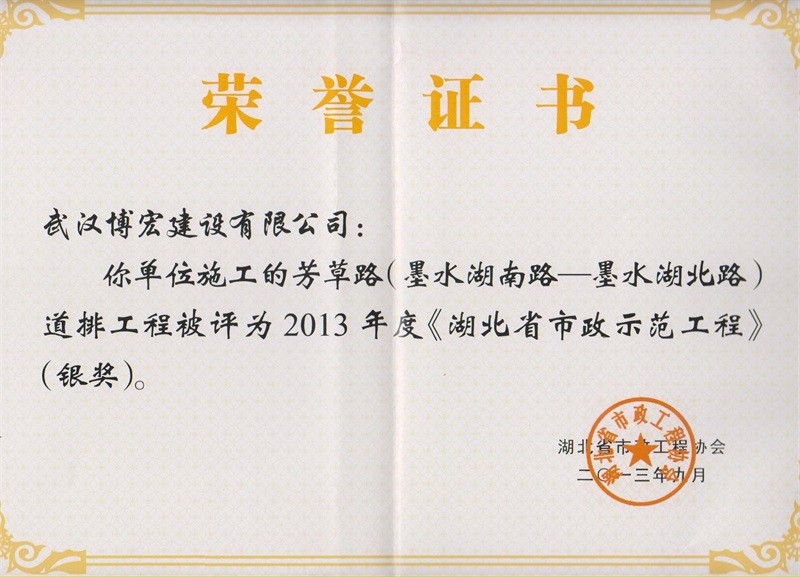 2013年度湖北省市政示范工程銀獎芳草路(墨水湖南-北路道排工程)