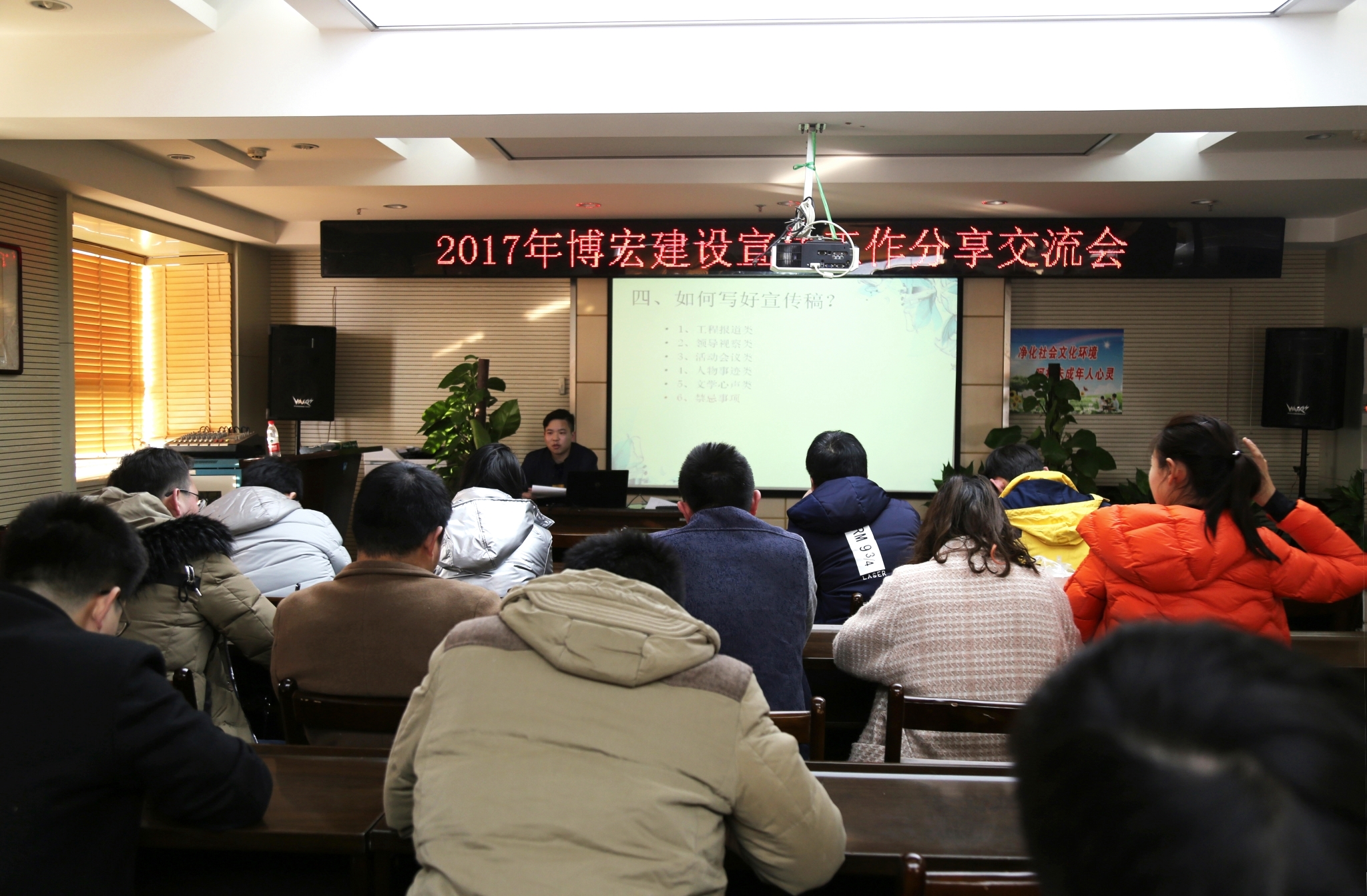 為強化職工宣傳工作意識,熟悉工作流程,提升工作技能,12月21日,博宏建設(shè)2017年宣傳工作分享會在公司會議室順利召開,來自公司各個部門及項目的20余名宣傳員齊聚一堂共同學(xué)習(xí)交流,分享工作心得。