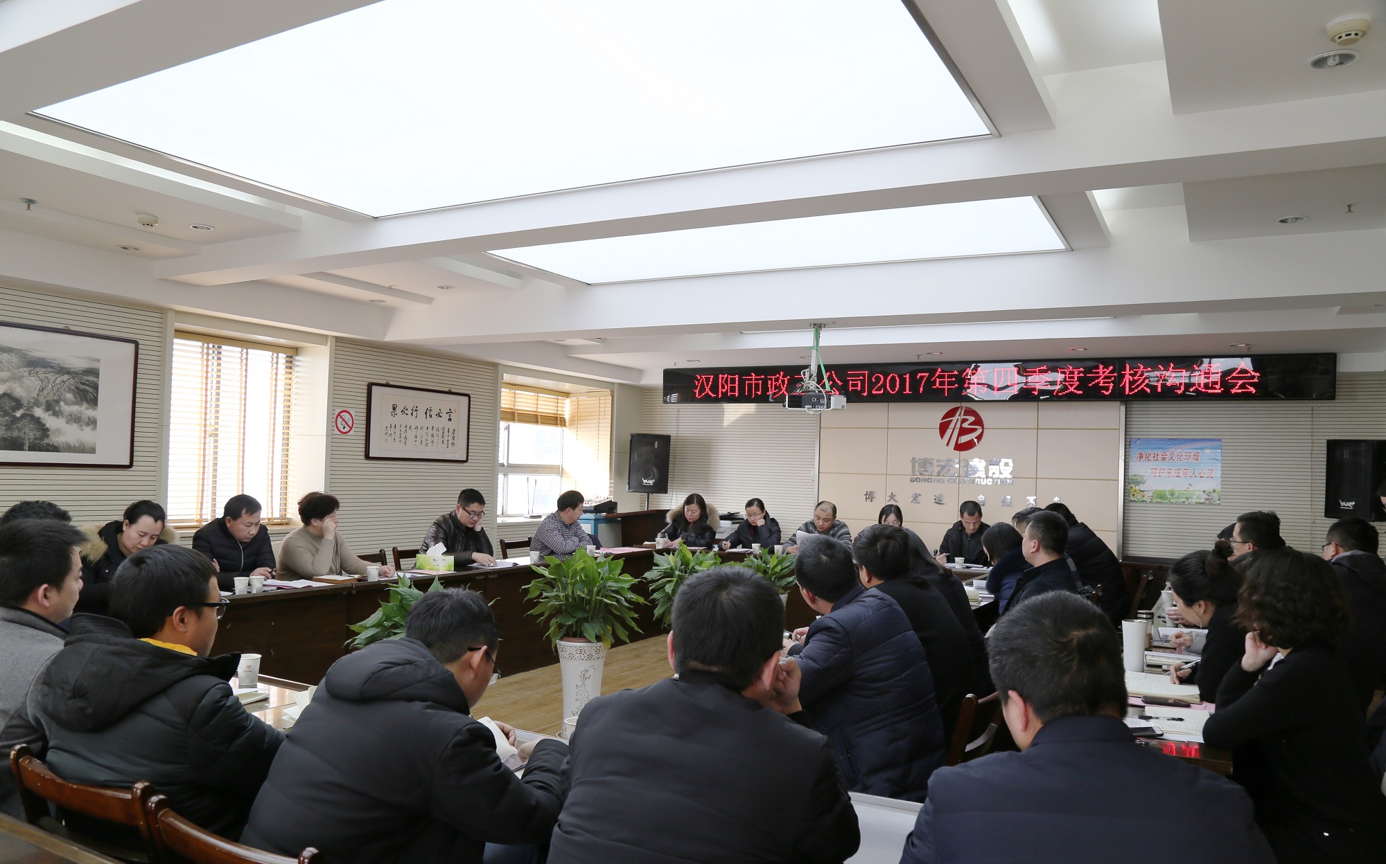 2018年1月9日下午,漢陽市政集團公司第四季度考核溝通會在博宏建設(shè)順利召開,集團總經(jīng)理虞志鵬、黨委副書記陳穎、工會主席黃桂華以及各職能部門負責(zé)人蒞臨指導(dǎo)工作,博宏董事長錢濤及其他班子成員等共計30余人參加會議。