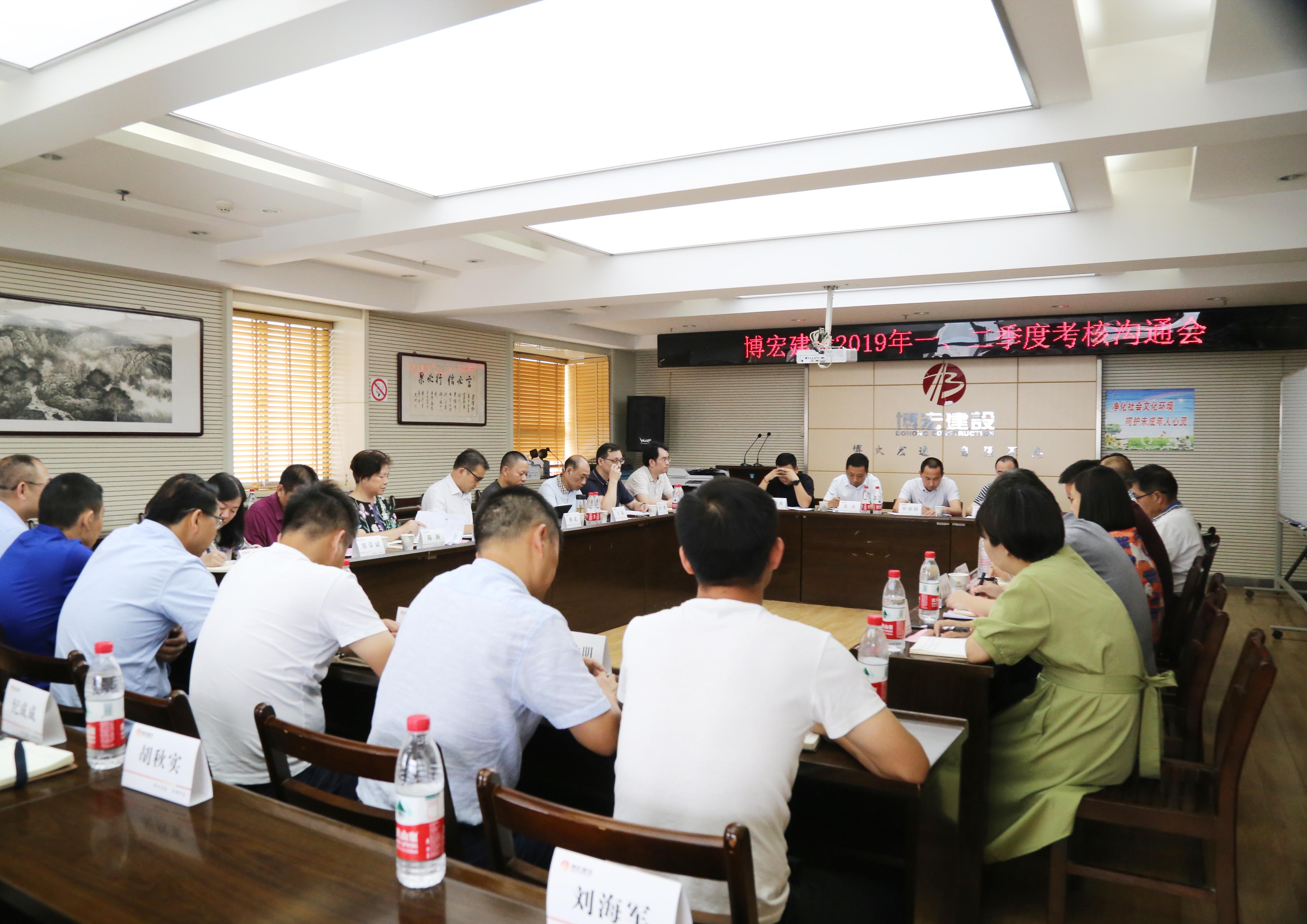 ?????????? 7月9日下午2:30,公司2019年一、二季度考核溝通會順利召開,會議就博宏建設(shè)上半年考核工作目標(biāo)完成情況進行了分析和交流,并就下半年工作思路進行進一步明確。漢陽市政集團公司黨委班子、各科室負責(zé)人、博宏建設(shè)支部班子、各部門負責(zé)人、項目經(jīng)理及技術(shù)負責(zé)人共計40余人參加了此次會議。