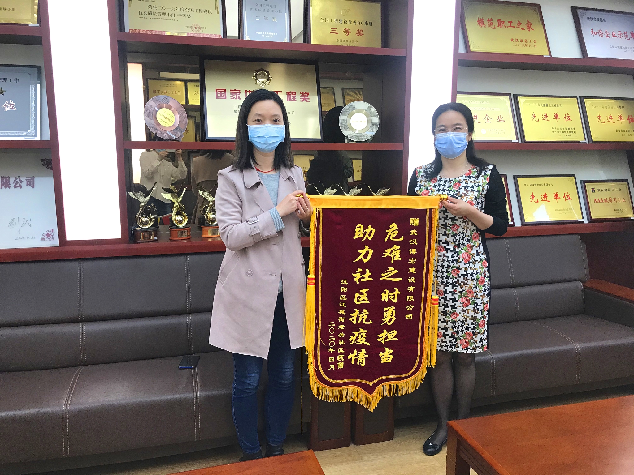 4月27日上午,武漢市漢陽區(qū)江堤街老關(guān)社區(qū)書記馮霞懷著一份感恩的心,將一面印有“危難之時(shí)勇?lián)?dāng),助力社區(qū)抗疫情”的錦旗送到博宏建設(shè)支部副書記郭一清的手中,感謝博宏建設(shè)在疫情期間主動(dòng)為社區(qū)提供生活保障物資的善舉。