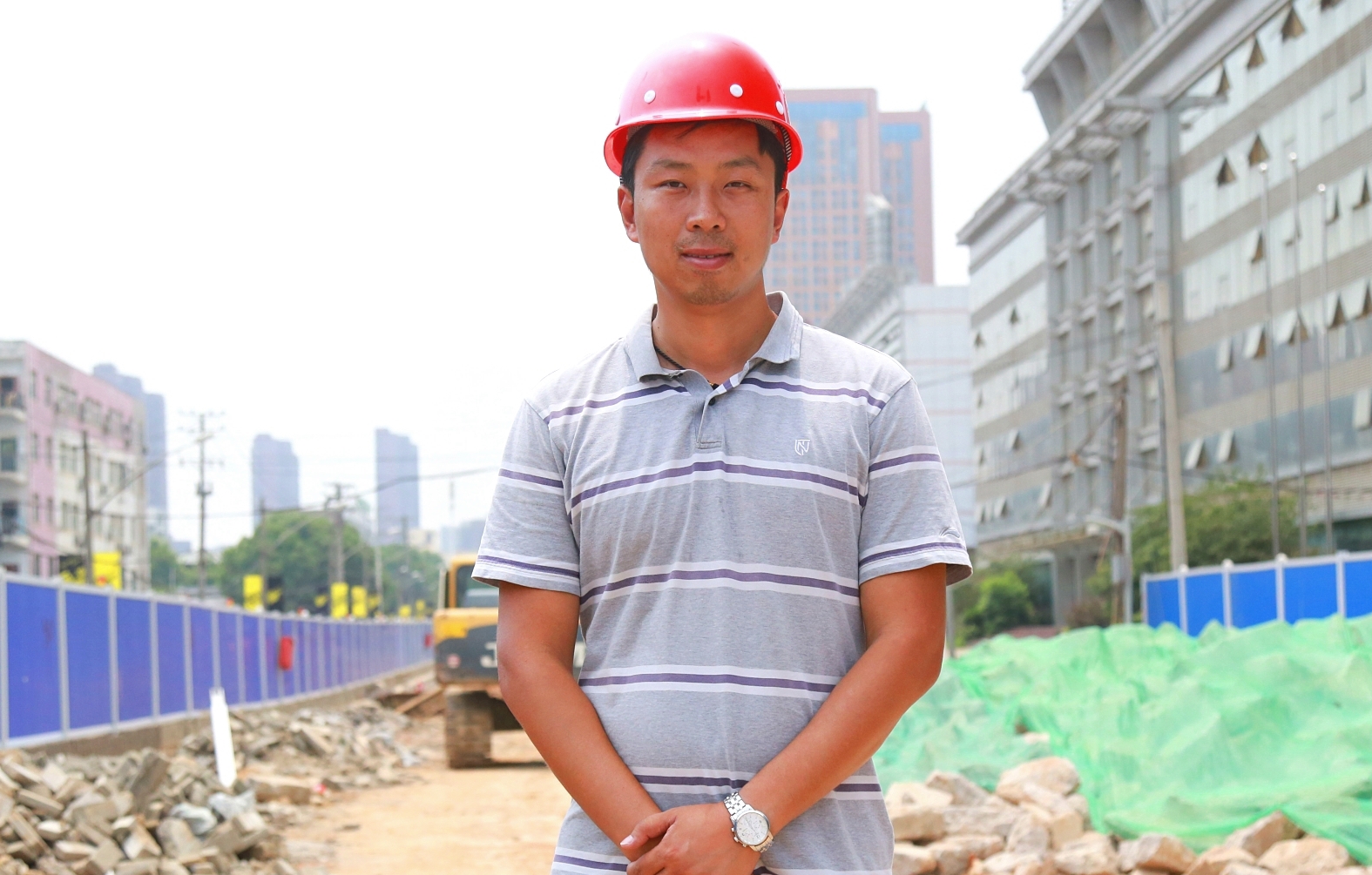八月的隆祥街工地,正值搶抓工期的關(guān)鍵時(shí)期,施工現(xiàn)場(chǎng)如火如荼,呈現(xiàn)一派熱火朝天的繁忙景象。在眾多忙碌的身影中,一位皮膚黝黑、身高一米九的壯漢顯得格外醒目,他頭頂烈日,神情專注地在現(xiàn)場(chǎng)指揮若定。為確保隆祥街如期刷黑通車,他帶領(lǐng)項(xiàng)目部人員爭(zhēng)分奪秒,晝夜奮戰(zhàn),連續(xù)高強(qiáng)度作業(yè),從不言苦累。而眼前這種施工場(chǎng)景,正是他十幾年如一日的工作常態(tài)。他就是博宏建設(shè)的項(xiàng)目經(jīng)理——童威。