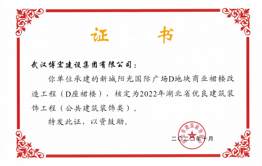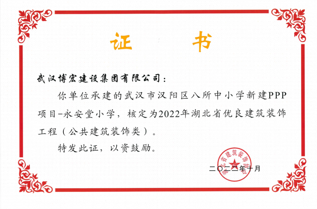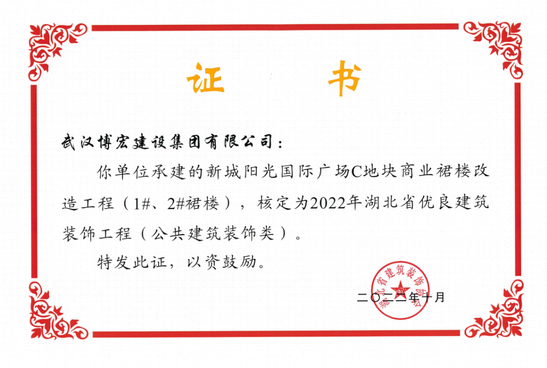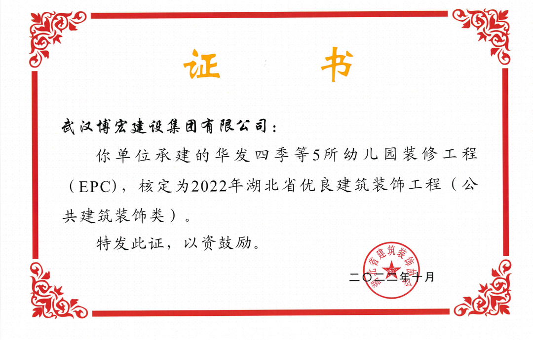 近日,湖北省建筑裝飾協(xié)會發(fā)布了《關(guān)于開展2022年湖北省建筑裝飾工程質(zhì)量目標考核工作的通知》,由博宏建設(shè)集團承建的華發(fā)四季等5所幼兒園裝修工程(EPC)、新城陽光國際廣場C地塊商業(yè)裙樓改造工程(1#、2#裙樓)、新城陽光國際廣場D地塊商業(yè)裙樓改造工程(D座裙樓)、武漢市漢陽區(qū)八所中小學(xué)新建PPP項目-永安堂小學(xué)被核定為“2022年湖北省優(yōu)良建筑裝飾工程(公共建筑裝飾類)”。