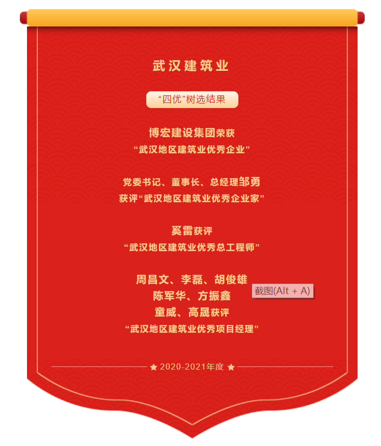 ? ? ? ? 近日,武漢建筑業(yè)協(xié)會(huì)發(fā)布2020-2021年度武漢地區(qū)建筑業(yè)優(yōu)秀企業(yè)、優(yōu)秀企業(yè)家、優(yōu)秀總工程師、優(yōu)秀項(xiàng)目經(jīng)理(以下稱為“四優(yōu)”)選樹結(jié)果。經(jīng)會(huì)員單位自主申報(bào)、協(xié)會(huì)組織專家評(píng)審、主管部門復(fù)核、武漢建協(xié)三季度會(huì)長辦公會(huì)審議通過并在協(xié)會(huì)網(wǎng)站進(jìn)行公示,“四優(yōu)”選樹結(jié)果名單火熱出爐。博宏建設(shè)集團(tuán)榮獲“武漢地區(qū)建筑業(yè)優(yōu)秀企業(yè)”;黨委書記、董事長、總經(jīng)理鄒勇獲評(píng)“武漢地區(qū)建筑業(yè)優(yōu)秀企業(yè)家”;奚雷獲評(píng)“武漢地區(qū)建筑業(yè)優(yōu)秀總工程師”;周昌文、李磊、胡俊雄、陳軍華、方振鑫、童威及高晟獲評(píng)“武漢地區(qū)建筑業(yè)優(yōu)秀項(xiàng)目經(jīng)理”。