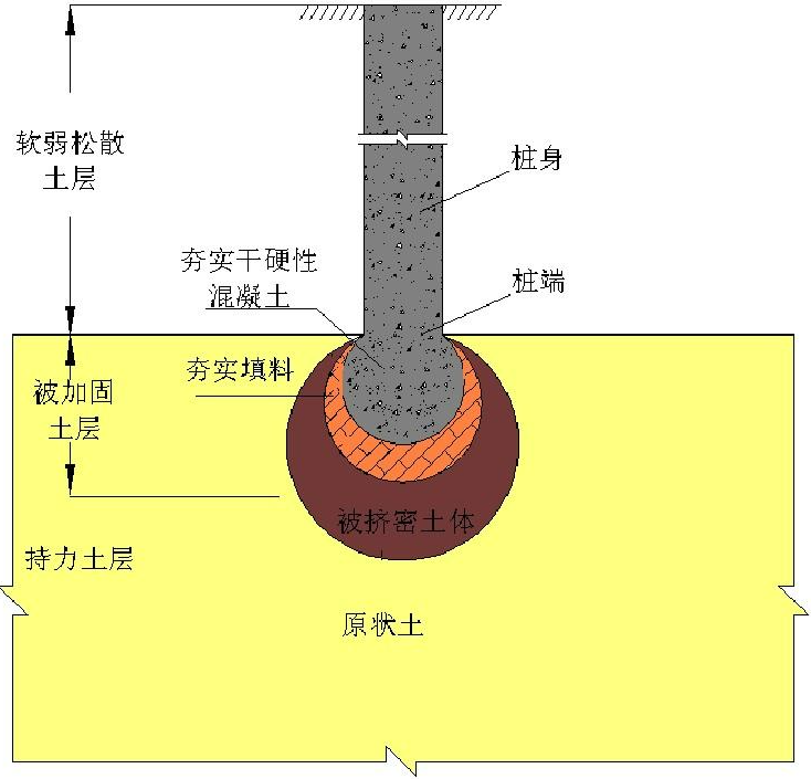 “載體樁”由上部樁身和下部“復合載體”兩部分組成。樁身一般為現(xiàn)澆鋼筋混凝土結構,“復合載體”是位于樁端底部、經(jīng)深層填料夯實的復合體。