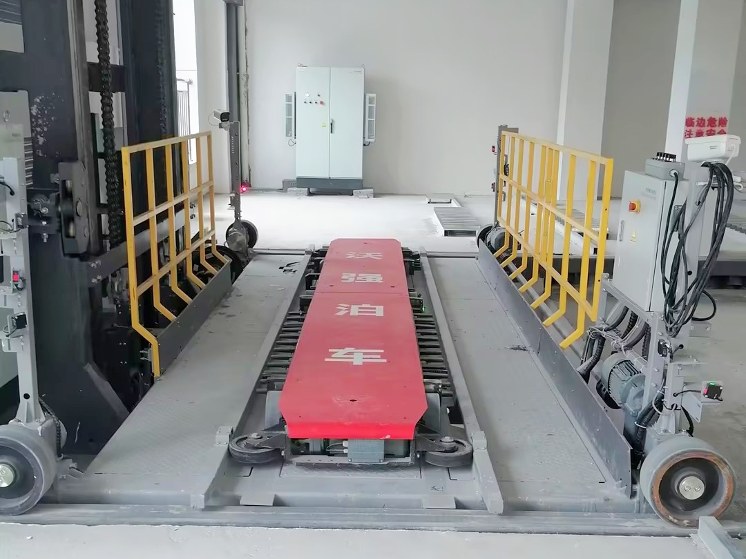 惠民苑社區(qū)服務(wù)中心改造工程EPC項目配備有地上6層的平面移動型車庫,共有127個車位,由轉(zhuǎn)盤、端部升降機(jī)、橫移臺車和梳齒搬運(yùn)器等設(shè)備組成完整的停車系統(tǒng)。轉(zhuǎn)盤設(shè)置在出入口車廳內(nèi),可實現(xiàn)汽車的轉(zhuǎn)向功能;端部升降機(jī)設(shè)置在車庫內(nèi)部巷道的側(cè)邊,可實現(xiàn)車輛的豎直提升功能;橫移臺車設(shè)置在升降機(jī)內(nèi),可實現(xiàn)車輛的橫向搬運(yùn)功能;梳齒搬運(yùn)器設(shè)置在橫移臺車內(nèi),采用電機(jī)驅(qū)動行走輪實現(xiàn)汽車縱移運(yùn)動,具有運(yùn)行平穩(wěn)、承載能力強(qiáng)的特點(diǎn);車庫總控制設(shè)備設(shè)置在一層監(jiān)控室內(nèi),用于所有停車機(jī)電設(shè)備的控制和調(diào)度。